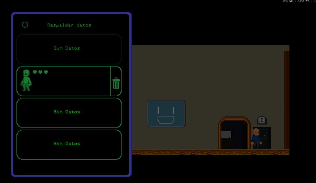 Sistema de guardado: Permite guardar la partida por medio de los ‘puntos de guardado’, estos por ahora tienen forma de un PC ladrillo (No se si lo voy a deja así 😅). Interactuar con los puntos de guardado abre una ‘versión’ del menu-in-game que habilita ranuras para guardar la partida (En este mismo se pueden eliminar).